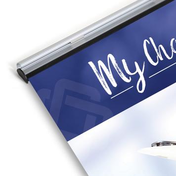 • Flip the rails open, insert your banner, and snap closed again