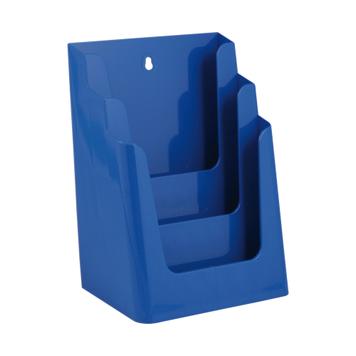 The 3-Tier Brochure Holder measures 12.6" high x 6" deep and is available in 11 different colors. It holds three tiers of 8.5" x 11" letterhead sized brochures, flyers or pamphlets.