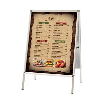 Our double-sided aluminum A-frame display board can be used indoors or outdoors and features snap frames on each side with flip-open profiles. Simply flip the sides of the frame open, insert your sign and snap the frame closed again. The A-Board folds for easy handling, has PVC covers and sturdy backing boards to help protect your signs, and is highly sturdy and stable. The A-board frames have 1.25" wide profiles and hold two 36" x 48" signs. The A-frame advertising board comes in an anodized silver finish with rounded corners and has non-slip rubber tips on its feet.
