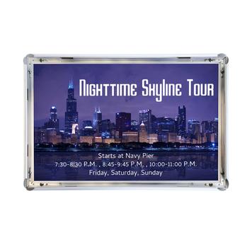 Poster snap frames are an economical solution for your business, home, or office and give you the flexibility to change your insert as often as you like. A non-glare, PVC cover and a rigid plastic backing help to protect your art, while the solid aluminum construction means that your poster frame won’t bow or sag. The snap frame holds an 11" x 17" insert.