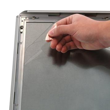 The sides of the snap frame flip open in front, making sign changes fast and easy. Simply snap the frame open, remove the clear cover, and swap out your sign. Note: although the frame, backing and cover are flame resistant, your sign’s fire resistance will depend on the material you print it on.