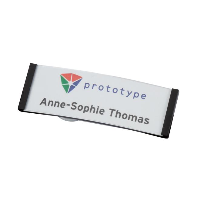 The Balance Series Name Badge is a stylish personalized name badge with a clear curved front and your choice of color accents on the ends. Crafted from transparent acrylic plastic, this reusable name tag can be personalized with names, job titles, company logos, and branding to create a polished and cohesive look. This high-quality name tag is ideal for using in offices, retail environments, hospitality industries, and conferences to promote clear communication and brand visibility.