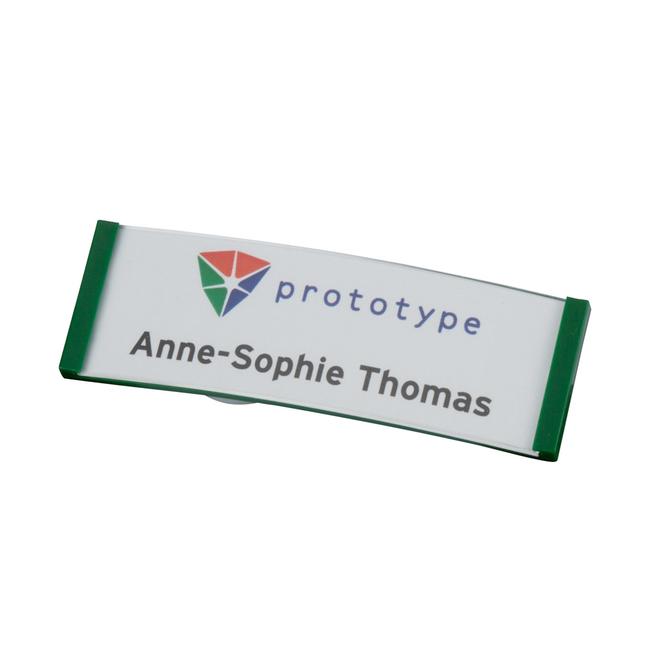 The Balance Series Name Badge is a stylish personalized name badge with a clear curved front and your choice of color accents on the ends. Crafted from transparent acrylic plastic, this reusable name tag can be personalized with names, job titles, company logos, and branding to create a polished and cohesive look. This high-quality name tag is ideal for using in offices, retail environments, hospitality industries, and conferences to promote clear communication and brand visibility.