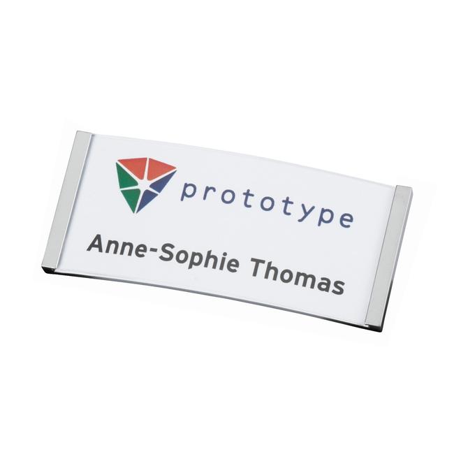 The Balance Series Name Badge is a stylish personalized name badge with a clear curved front and your choice of color accents on the ends. Crafted from transparent acrylic plastic, this reusable name tag can be personalized with names, job titles, company logos, and branding to create a polished and cohesive look. This high-quality name tag is ideal for using in offices, retail environments, hospitality industries, and conferences to promote clear communication and brand visibility.
