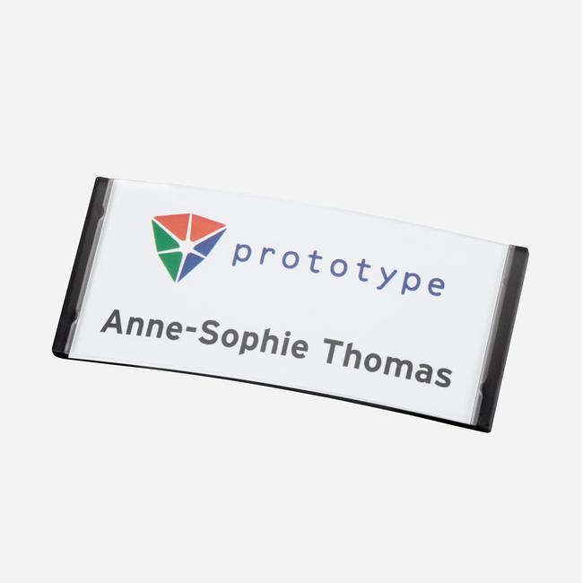 The Balance Series Name Badge is a stylish personalized name badge with a clear curved front and your choice of color accents on the ends. Crafted from transparent acrylic plastic, this reusable name tag can be personalized with names, job titles, company logos, and branding to create a polished and cohesive look. This high-quality name tag is ideal for using in offices, retail environments, hospitality industries, and conferences to promote clear communication and brand visibility.