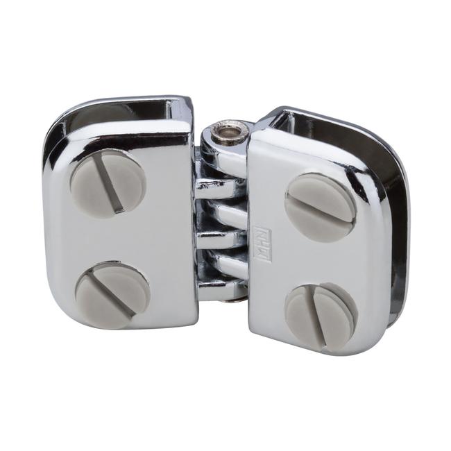 This Chrome Plated Panel Connector is a swinging double door hinge that holds two glass, plastic or other panels between 0.12" and 0.20" thick. The hinge works well for adding doors to fixed displays. The plastic tightening screws will not scratch the panels as much as steel screws do.