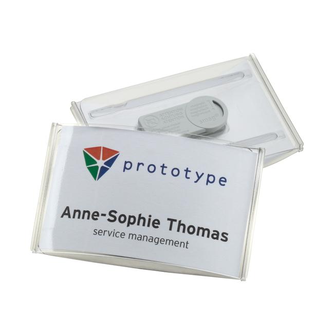 Designed for long-lasting use, this name badge folds over your name tag. You also have the option of inserting the paper tag into it. It measures 3.5" x 2.2" and has a magnet on back for mounting.