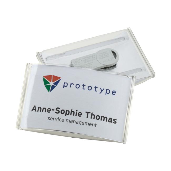 Designed for long-lasting use, this name badge folds over your name tag. You also have the option of inserting the paper tag into it. It measures 3.5" x 2.2" and has a magnet on back for mounting.