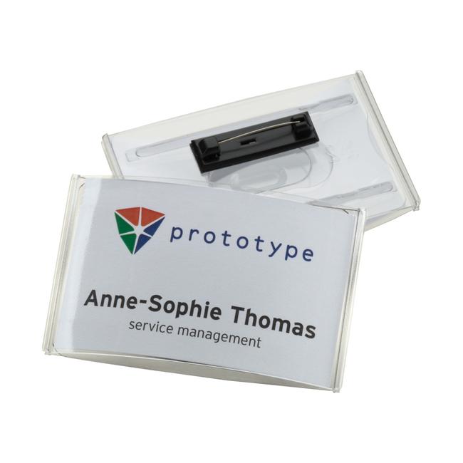 Designed for long-lasting use, this name badge folds over your name tag. You also have the option of inserting the paper tag into it. It measures 3.5" x 1.5" and has a mounting pin on back.