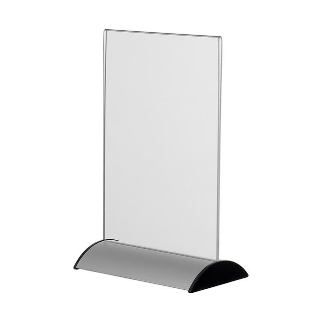 The Menu Card Holder with Aluminum Stand is a table sign holder with a contemporary design. It features a clear acrylic sleeve for sliding your sign into and a squeeze-open base which clamps onto the sign pocket. The aluminum base is topped off by two black plastic end caps for an added touch of class.