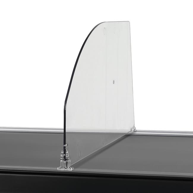 The MP Series Slanted Shelf Divider is the ideal solution for organizing products on shelves. Made of clear polycarbonate plastic, this durable divider stands 7.87" tall and 15.16" long. Its slanted shape supports smooth product access while adding a clean, modern look to your display. It securely attaches to the shelf for quick, stable installation via the Adhesive Front T-Rail and the Divider PEK Back Rail (sold separately.) Several shelf dividers can be attached to the front and back rails and can be removed and relocated with ease. The shelf divider can also be used to separate the Series VI Shelf Pushers. It is perfect for maintaining order and visibility in retail or storage environments.