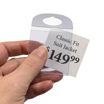 Plastic hang tabs provide a cohesive, streamlined look that works well across different sections of a store, from casual wear to seasonal displays. Your price tag slides into the side of the hang tab.