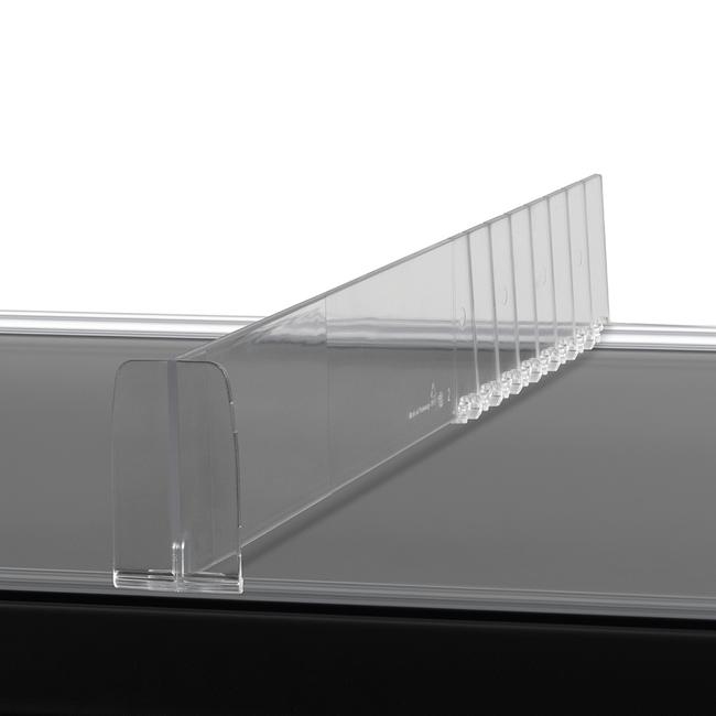 This shelf separator is made from clear, durable PET plastic. It is designed to be paired with the Adhesive T-Rail for Shelf Divider and the Divider Rail PEK (sold separately.) These rails mount to the front and back of the retail shelf, and then the shelf divider snaps onto the rails. The shelf divider can then be easily removed and relocated on the front and back rails. Adjustable shelf dividers are particularly beneficial, as they can be customized to accommodate products of various shapes and sizes, maximizing the use of available space. Shelf dividers can also be paired with our assortment of Series VI and VII shelf pushers (sold separately.)