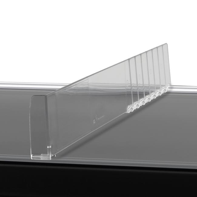 This shelf separator is made from clear, durable PET plastic. It is designed to be paired with the Adhesive T-Rail for Shelf Divider and the Divider Rail PEK (sold separately.) These rails mount to the front and back of the retail shelf, and then the shelf divider snaps onto the rails. The shelf divider can then be easily removed and relocated on the front and back rails. Adjustable shelf dividers are particularly beneficial, as they can be customized to accommodate products of various shapes and sizes, maximizing the use of available space. Shelf dividers can also be paired with our assortment of Series VI and VII shelf pushers (sold separately.)