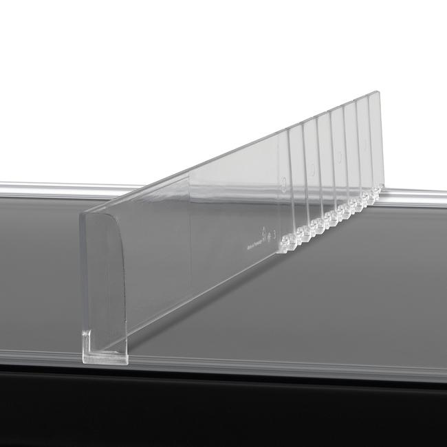 This shelf separator is made from clear, durable PET plastic. It is designed to be paired with the Adhesive T-Rail for Shelf Divider and the Divider Rail PEK (sold separately.) These rails mount to the front and back of the retail shelf, and then the shelf divider snaps onto the rails. The shelf divider can then be easily removed and relocated on the front and back rails. Adjustable shelf dividers are particularly beneficial, as they can be customized to accommodate products of various shapes and sizes, maximizing the use of available space. Shelf dividers can also be paired with our assortment of Series VI and VII shelf pushers (sold separately.)