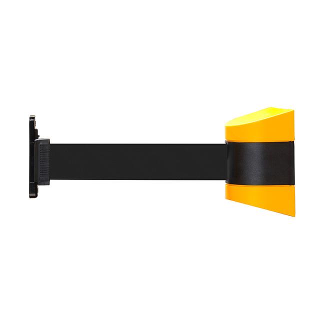 The Tensa Series Wall Mounted Barrier Tape is a space-saving and efficient crowd control and safety solution for blocking off areas or directing foot traffic. It features a 2" wide by 15 ft. long black tape barrier, a yellow plastic wall mounting bracket, and a plastic mounting bracket on the end of the tape.
