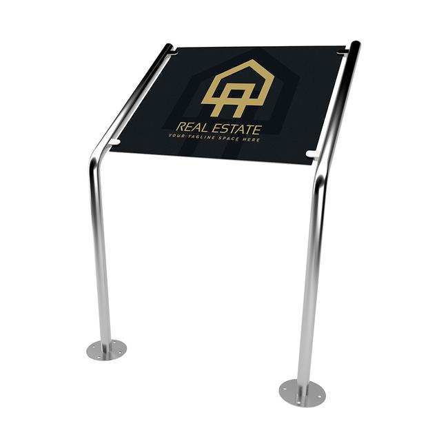 This freestanding sign stand includes two stainless steel poles and four brackets for attaching your sign (not included.) It holds a 11.7" x 16.5" sign. The poles are installed by screwing the flange ground plates into existing concrete.