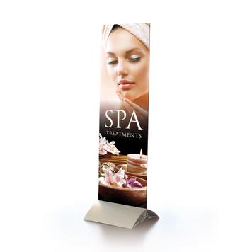 The Unico Base is a 10" wide aluminum sign stand designed to hold rigid signage in thicknesses up to 1.125". Sign changes are simple with no tools necessary. A plastic knob at the base of the display is tightened to grip and hold your sign in place.