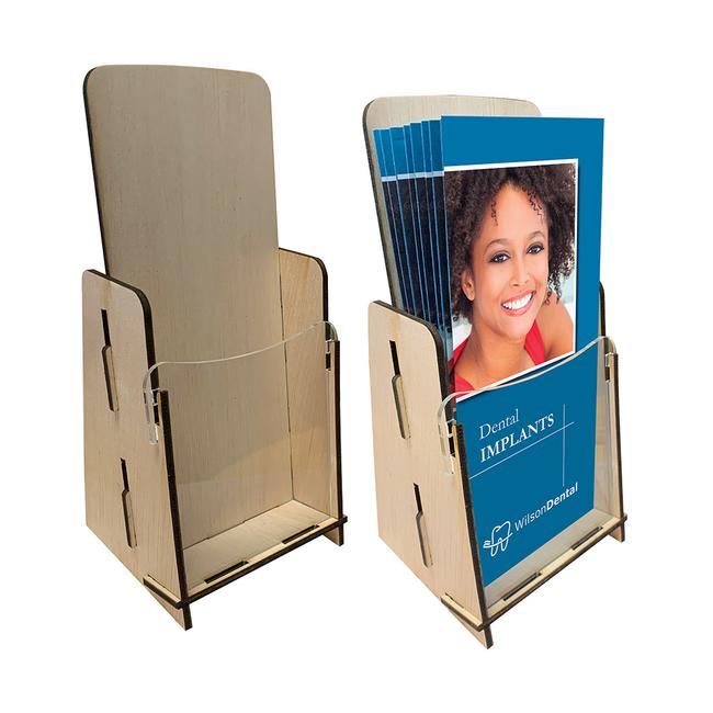 Enhance your literature displays with the beauty of real wood. Our Wooden Brochure Holder is made from eco-friendly natural wood with an acrylic front. It has a wide base and a slanted design for holding 4" x 8.5" trifold-sized flyers, pamphlets, and brochures. The Wooden Brochure Holder ships flat and slots together for easy assembly. This wooden brochure stand is ideal for retail displays, information desks, reception areas and more. We can also print or laser engrave the Wooden Brochure Holder with your logo or custom graphics . Contact us for custom printing options.