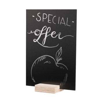 The chalkboard stand can be written and drawn on with chalks and chalkboard markers. The chalkboard signs can be used to advertise daily specials and special promotions, post menus, label table numbers, or feature other messages. The eco friendly wooden base lends solid support to the custom chalkboard signs, and the affordable price makes this chalkboard stand ideal for restaurants, grocery stores, retail stores, personal and corporate events, and more. The Double-Sided Chalkboard Panel is available in four sizes and can be mixed and matched with our full range of tabletop chalkboard signs.